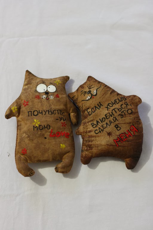 Случайно блуждая по интернету наткнулась на таких смешнючих котиков и не удержалась. Уже через пару минут нашла белую простынь хрясь..., строчила котиков, выворачивала, набивала (пригодились обрезки утеплителя алполюкс от зимнего костюма, не самый хороший вариант для котиков, но другого дома просто не было). Растворимого кофе в доме на нашлось, на молола кофе, сварила его с корицей (запах по всей квартире), выпила чашечку (дело было рано утром). Проснулась Катя и начали мы красить котиков кофе...как только их не красили, но ровного окраса так и не получила, все коты с разводами.